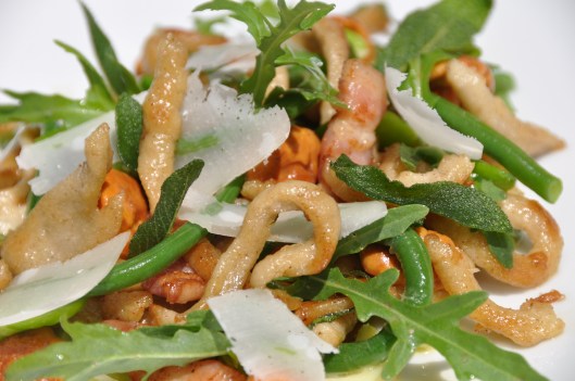 Une fois confectionnés, ils sont poêlés et servis avec du lard rissolé, des feuilles de sauge, des épinards, du chou frisé ou des haricots verts et souvent gratiné avec du fromage.