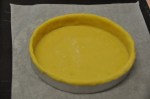 Abaisser la pâte à 2mm environ et foncer un cercle ou une plaque d’un diamètre 20cm environ. Laisser déborder les bords et les mouiller légèrement.