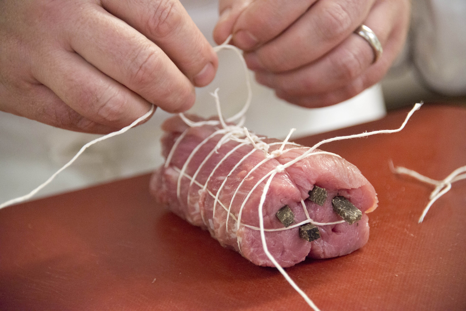 Ficeler le mignon en terminant par deux larges boucles de façon à pouvoir y passer une cuillère en bois et qu’il puisse être suspendu dans la casserole de bouillon de bœuf.