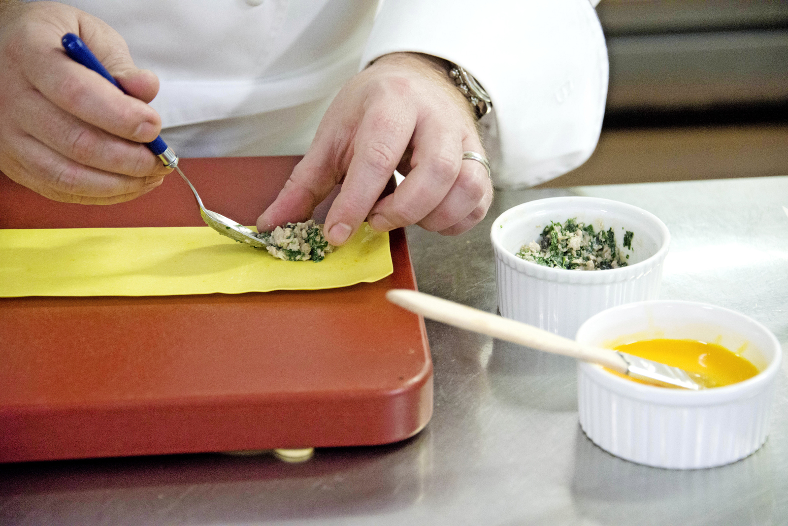 Abaisser la pâte au laminoir à 1mm d’épaisseur. Détailler des rectangles de 5cm de large sur 20 de long. Badigeonner de jaune d’œuf et disposer des petites boules de farce sur toute la longueur en les espaçant de 3cm environ.