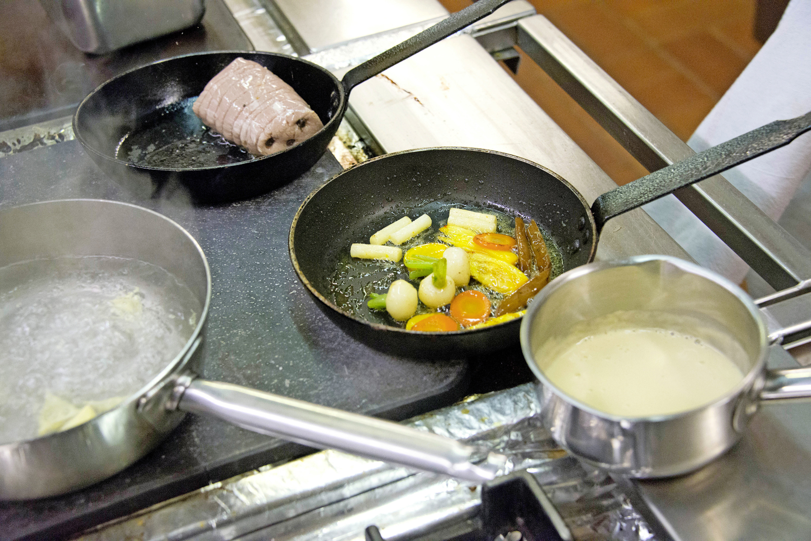 Égoutter le filet mignon de veau, le déficeler et le rôtir rapidement à la poêle afin de lui donner un aspect appétissant. Cuire les ravioles à l’eau bouillante salée, les égoutter dans une sauteuse. Ajouter les légumes cuits et les enrober avec une noix de beurre. Assaisonner les bâtonnets de truffes restants avec un filet d’huile d’olive et un peu de fleur de sel.